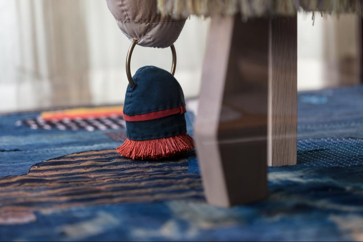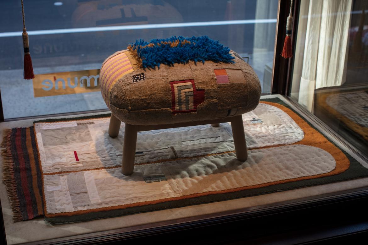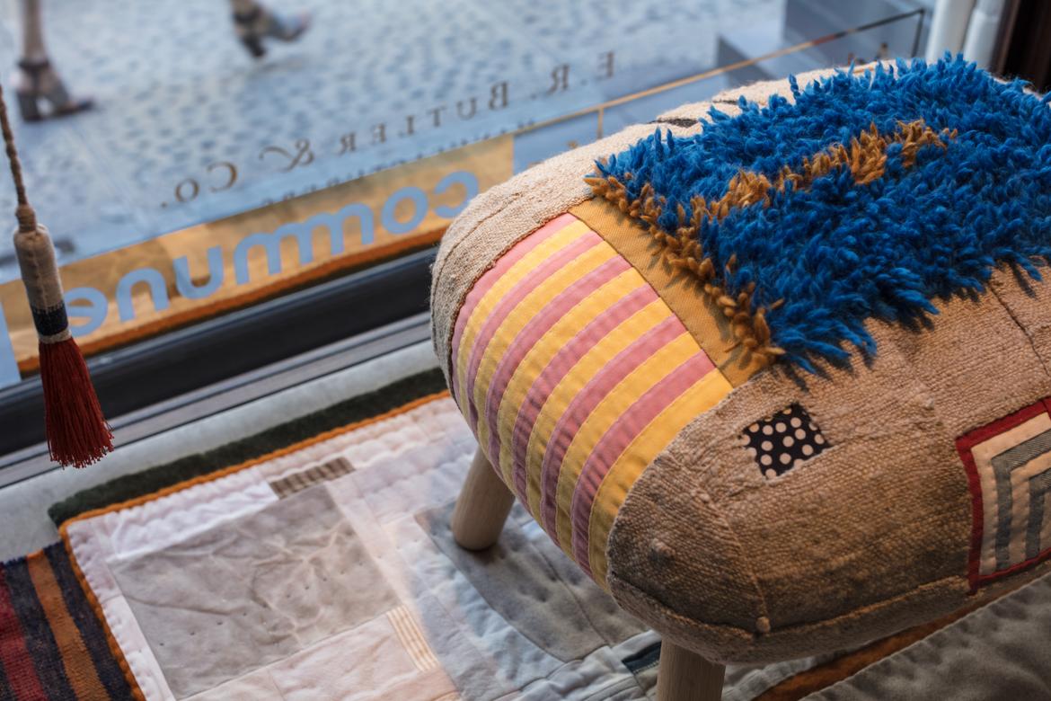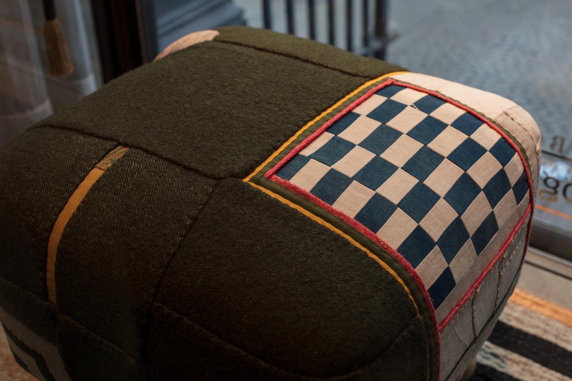 Adam Pogue works with Commune on product and special projects using textile remnants and vintage fabrics that Commune finds along the way. Obi fabrics from a trip to Japan, army canvas used for upholstery, and discarded carpet and drapery remnants are all reconfigured to create a new textile experience. Adam creates compositions that are familiar and yet completely original; with hand stitched details, pops of unexpected color, and unconventional shapes and material combinations.
