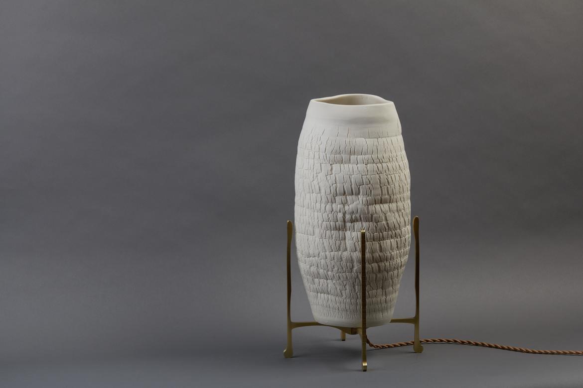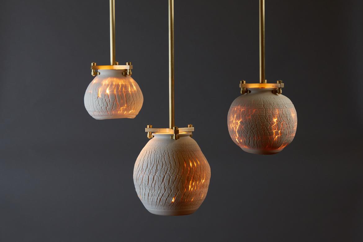 Inspired by the beauty of a dried-out desert lake bed, each piece is a handmade one-of-a-kind object that produces a mysterious quality when internally lit, embracing the flaws and accidents inherent in the craft and process of making: the series exemplifies the wabi-sabi ethos of acceptance of transience and imperfection.