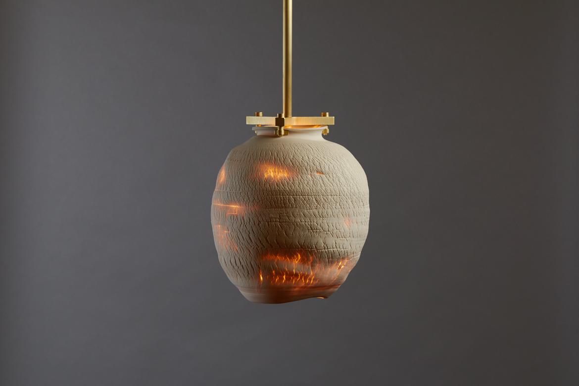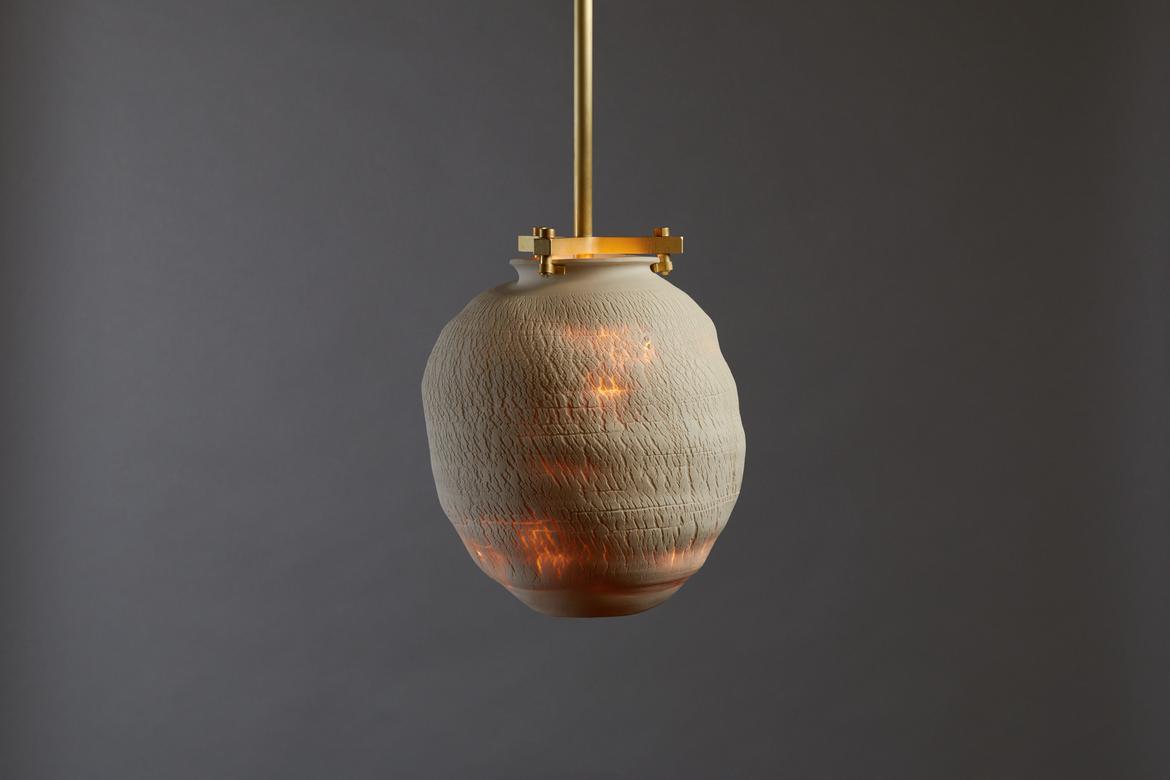 Each piece in the Desert Series is a unique work of art, made of porcelain using a unique fabrication technique developed with Paone’s paternal aunt, the ceramicist Anne Paone. Two new additions in this series, the Desert Table Lamp and Large Desert Pendant in the Negative Finish, offer the same visual and textural elements in an alluring shade of black with blackened brass hardware. The Negative Finish, conceived with new collaborator ceramicist Jeff Nimeh, takes the original series and inverts the aesthetic using metallic oxides and carbonates.